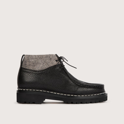 This low boot design features a quarter made from a single piece of leather, hand-stitched to an apron with a leather-bound edge. Its collar in Grey Felted Velvet adds a touch of originality, while a gusset ensures waterproofing.
